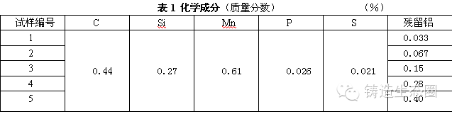 2. castings in the better residual amount of aluminum (1) the preparation of specimens in the 500kg coreless frequency induction furnace (acidic lining) for melting, refining period to add sedation with 200g of aluminum, when the metal liquid temperature to 1580 ~ 1600 ℃ (optical pyrometer, uncorrected), with aluminum for the end of the deoxygenation (added amount of 500g), blackout static for 2min, skimming slag, out of the steel. Five single-root forming specimens with different residual aluminum contents were produced by placing different weights of aluminum for supplemental deoxidation in the pouring ladle in advance.