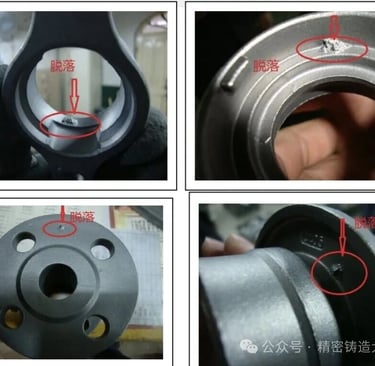 By sectioning the shell, we found that the inner surface of the shell had been pushed open by impurities after dewaxing, causing spalling on the casting surface. Further observation revealed that products using zircon sand for both primary coats (the second coat adhered to zircon sand) did not exhibit spalling. This indicated that the defect originated from the second layer of fine mullite sand.