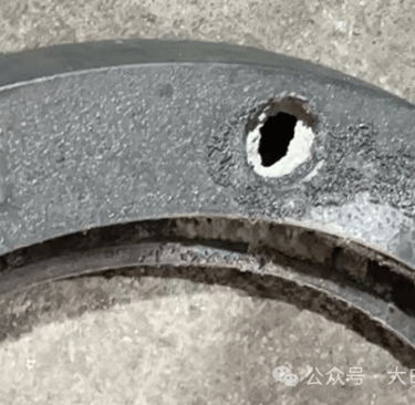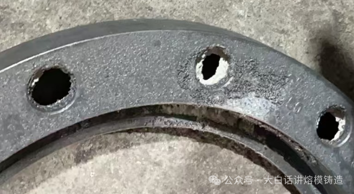 First, the defect at the hole location in Figure 1 is most likely sand burning. Judging from its appearance, the local defect looks as if the metal melted and fused with the sand. However, upon further consideration, another possibility is that molten steel leaking from the hole pooled around its periphery. This possibility cannot be ruled out, as the photo of the hole shows traces of metal leakage inside it.